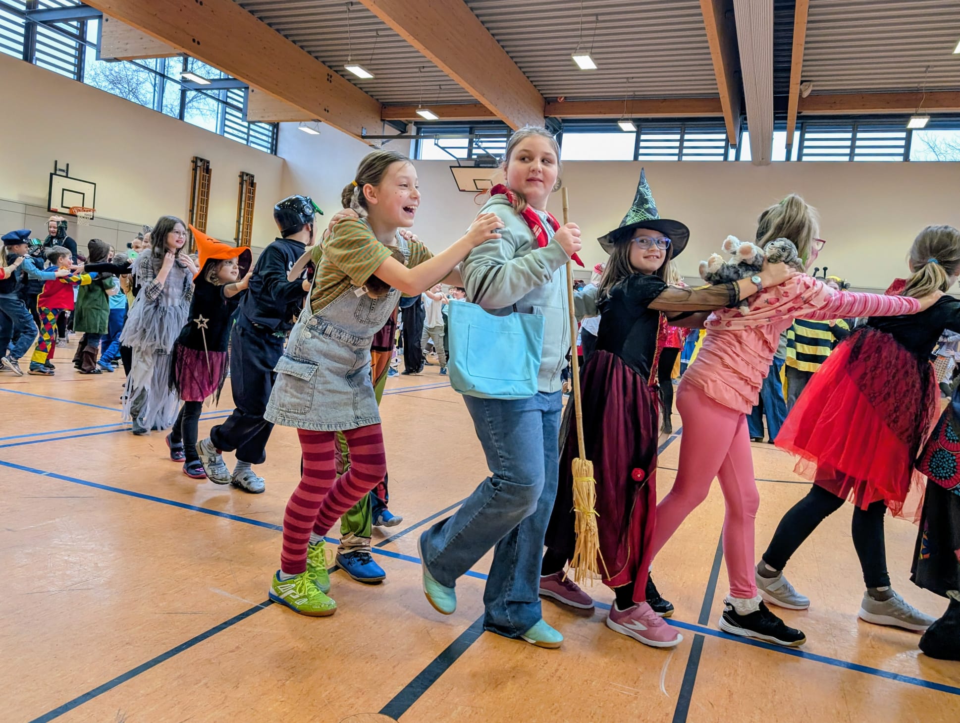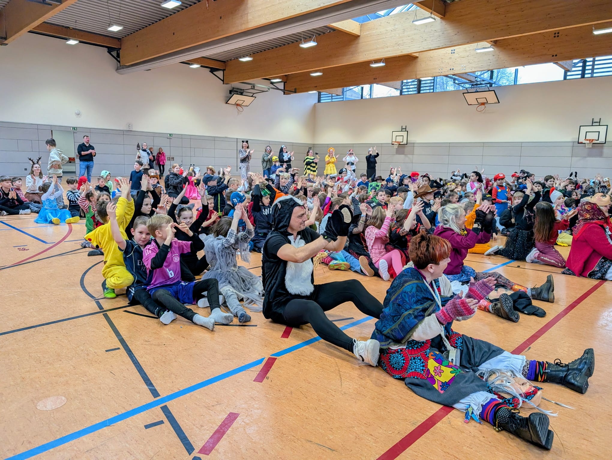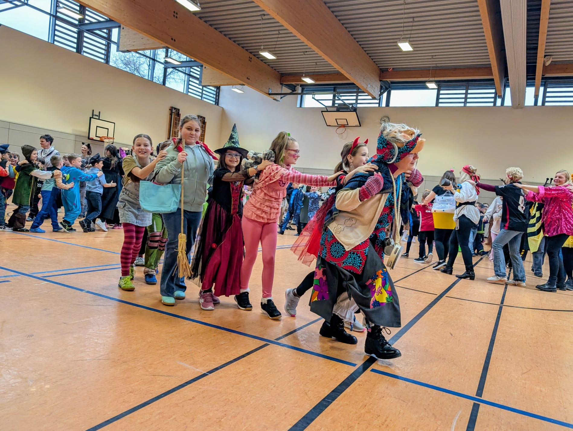 Neben den Feierlichkeiten in den Klassen trafen sich die phantasievoll verkleideten und bestens gelaunten Kinder und Lehrkräfte zu einer großen gemeinsamen Feier in der Turnhalle. Der Höhepunkt war selbstverständlich der Besuch der Hembacher Hexen, die mit Musik, Tanz und ihrem Hexen-Schlachtruf noch einmal richtig Schwung in die Halle brachten. Auch danach wurde in vielen Klassen noch weitergefeiert, teilweise durften die Kinder auch am Freitag noch einmal verkleidet kommen.