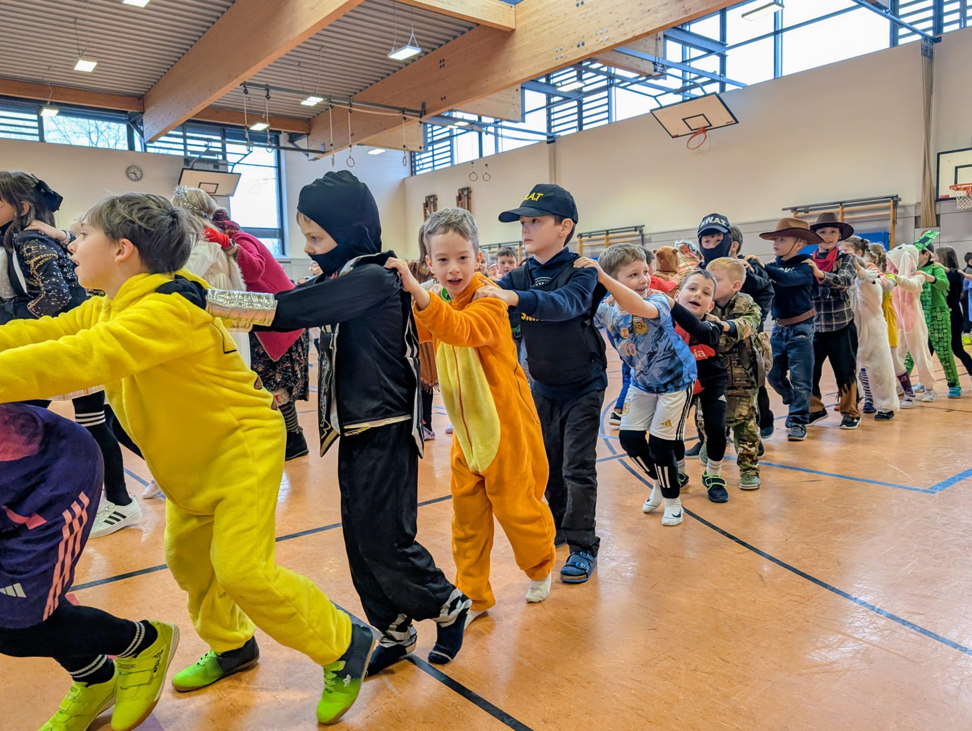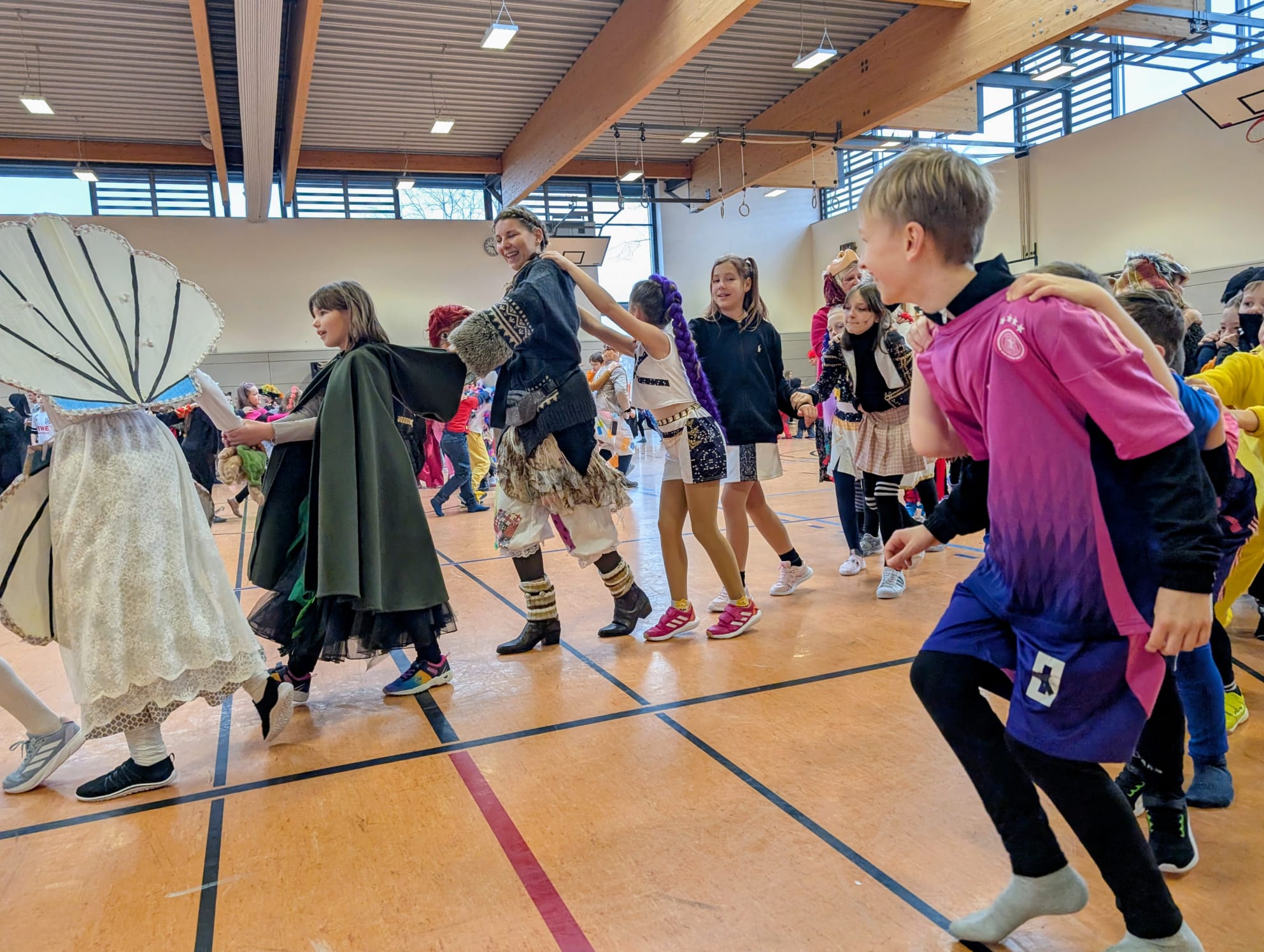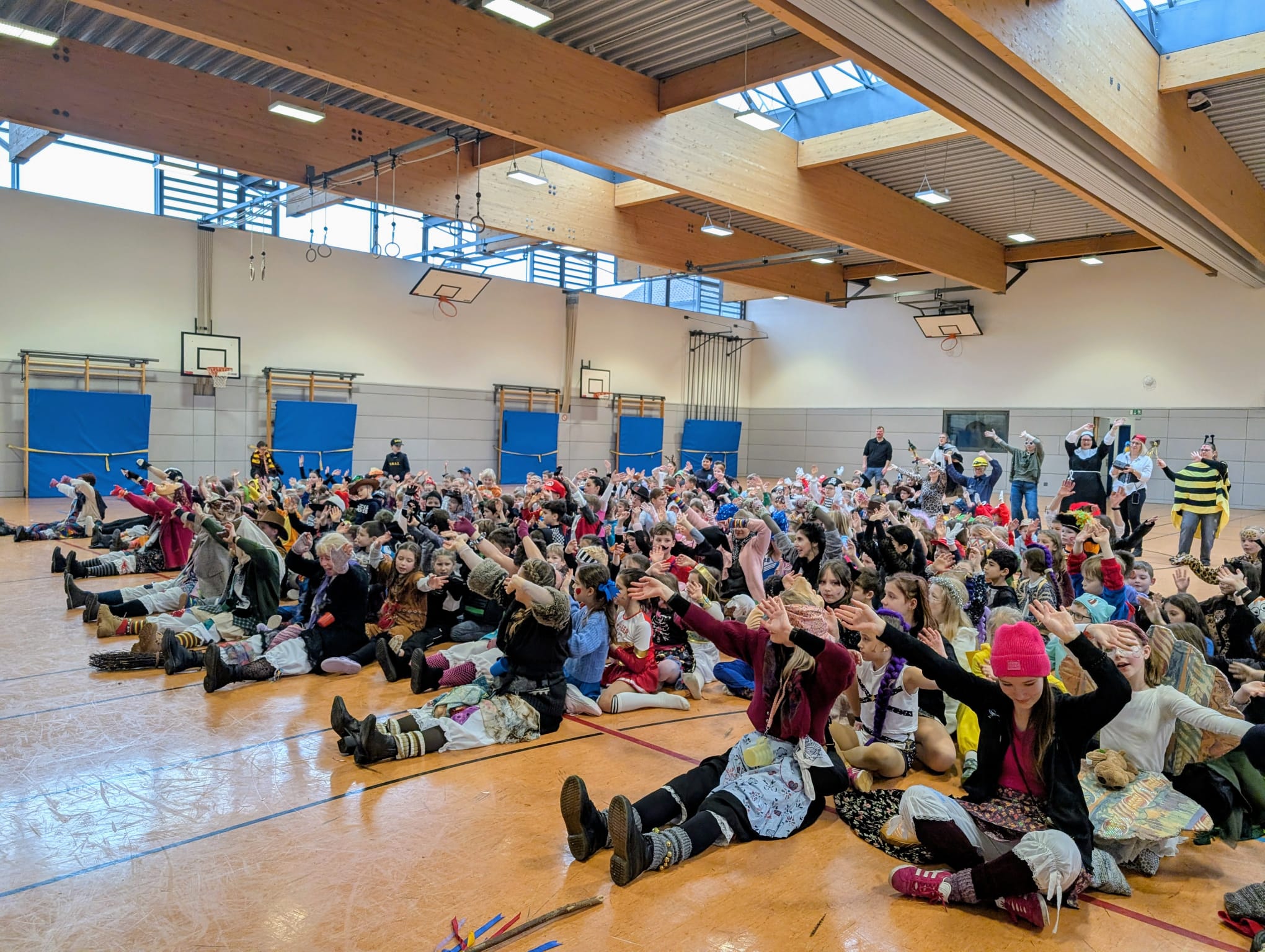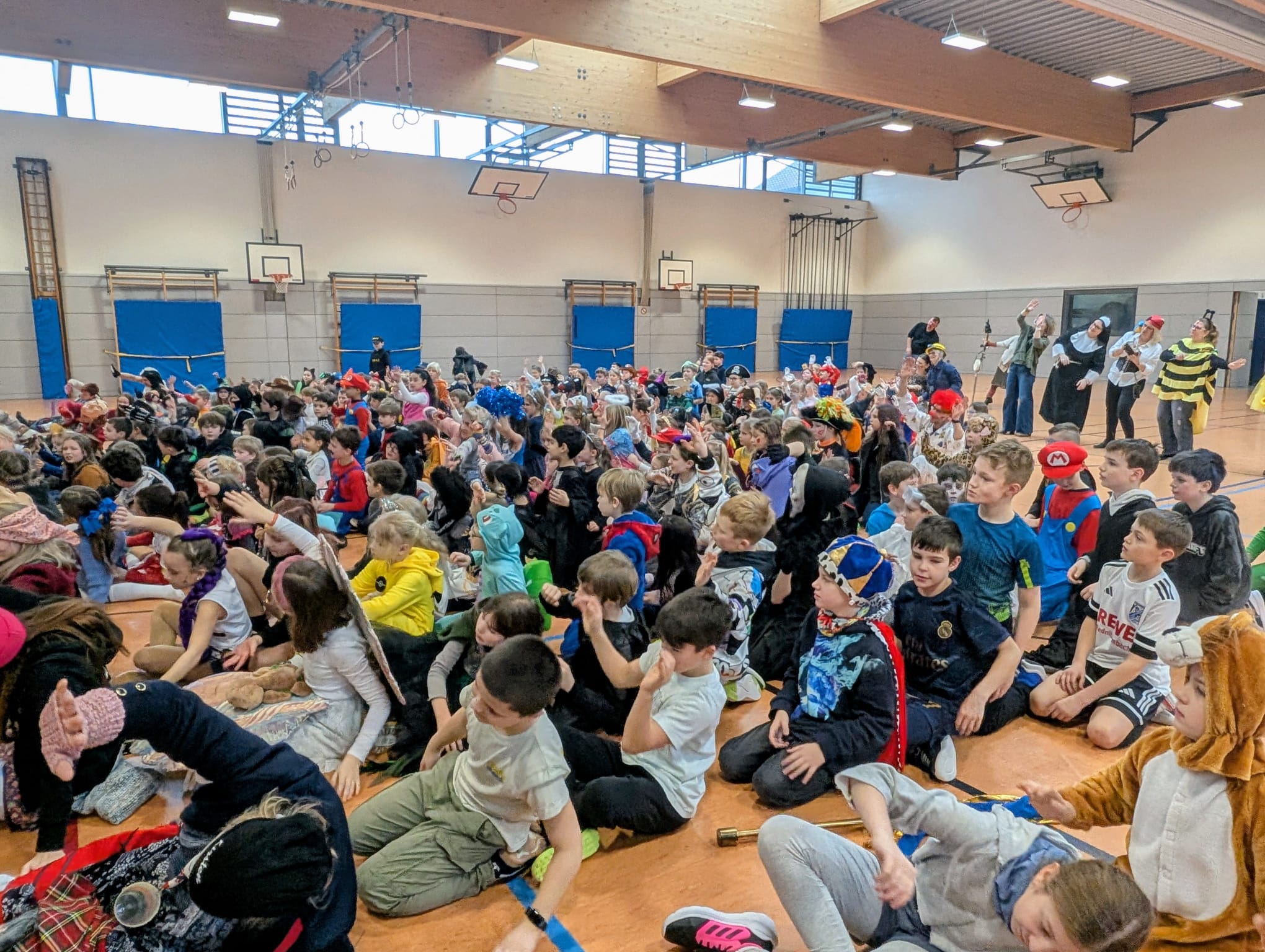 Neben den Feierlichkeiten in den Klassen trafen sich die phantasievoll verkleideten und bestens gelaunten Kinder und Lehrkräfte zu einer großen gemeinsamen Feier in der Turnhalle. Der Höhepunkt war selbstverständlich der Besuch der Hembacher Hexen, die mit Musik, Tanz und ihrem Hexen-Schlachtruf noch einmal richtig Schwung in die Halle brachten. Auch danach wurde in vielen Klassen noch weitergefeiert, teilweise durften die Kinder auch am Freitag noch einmal verkleidet kommen.
