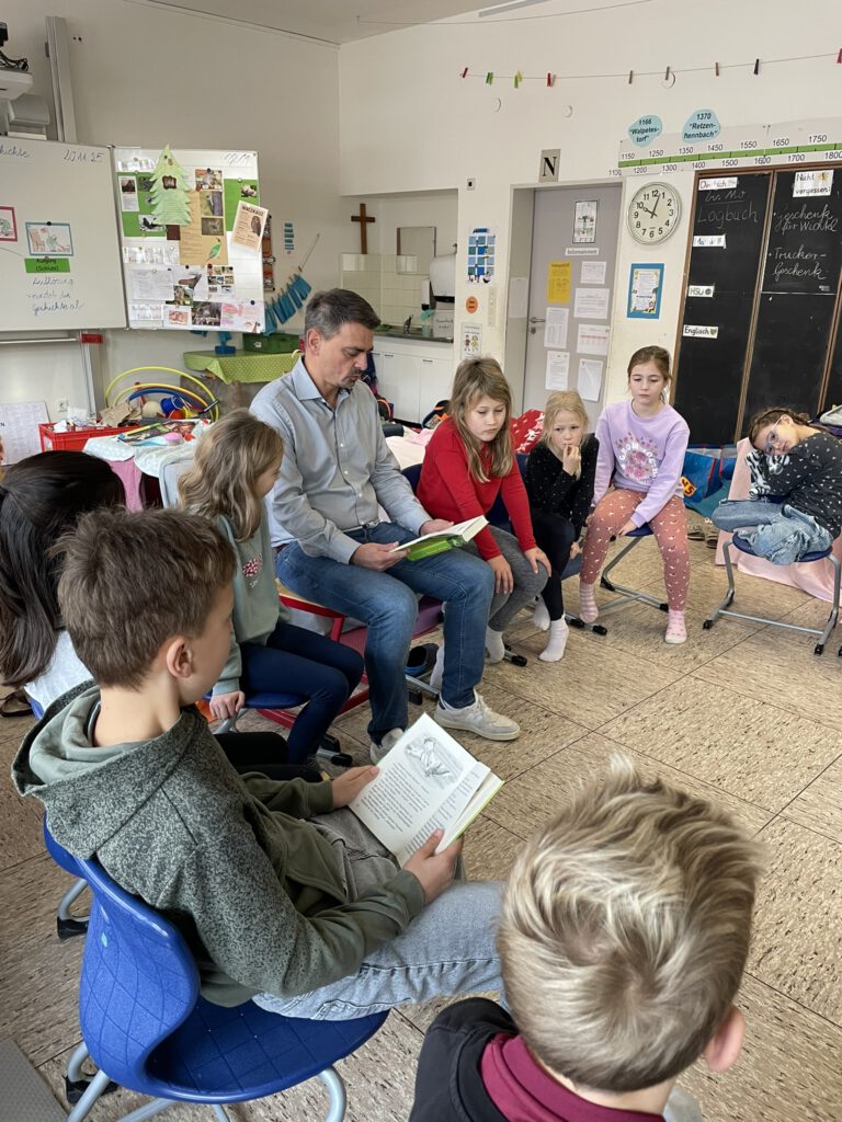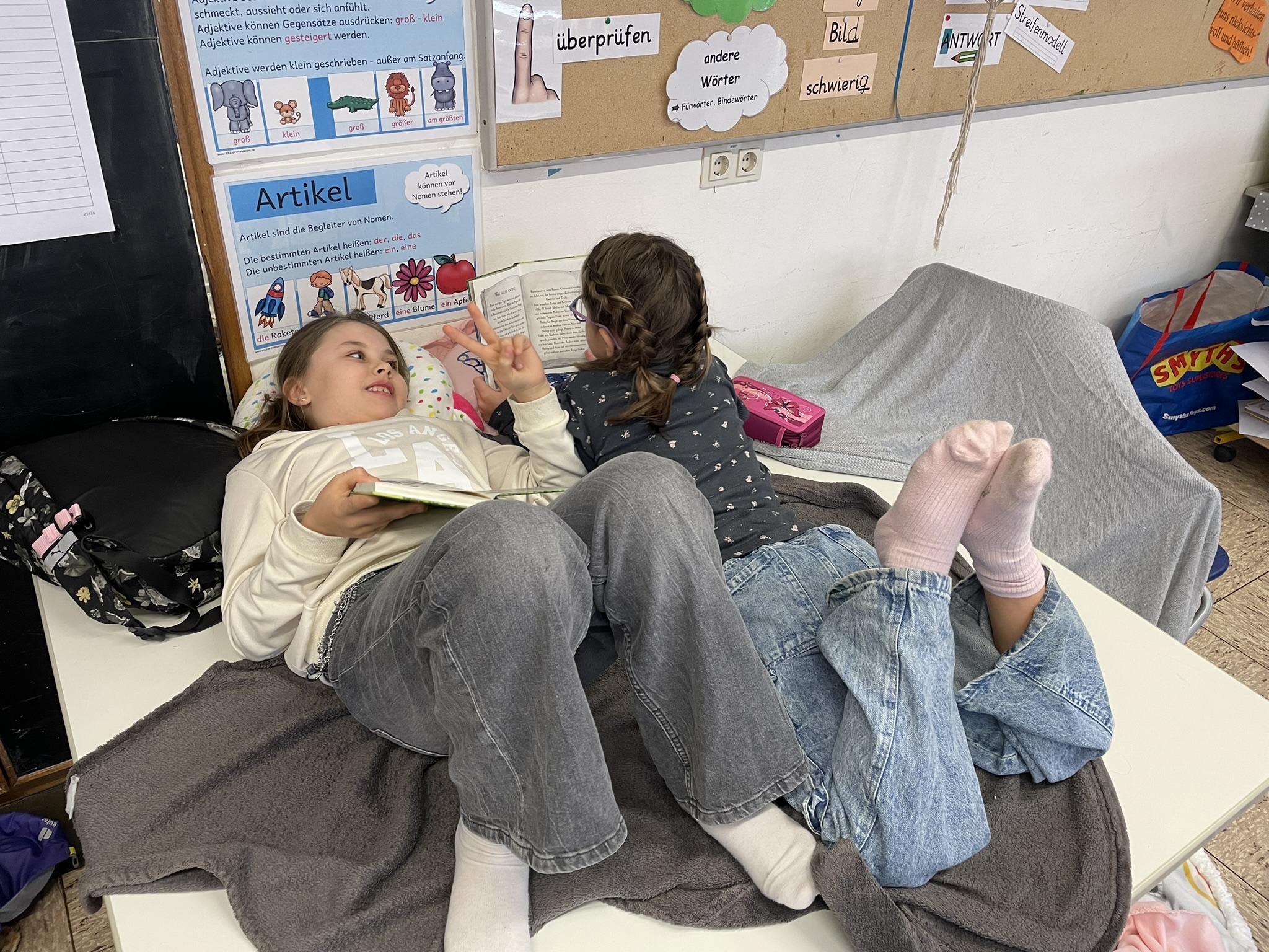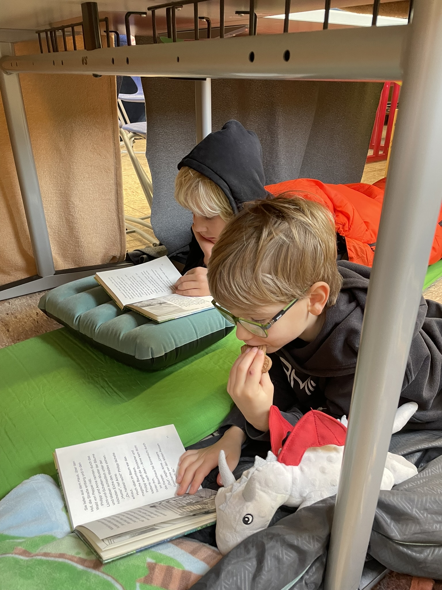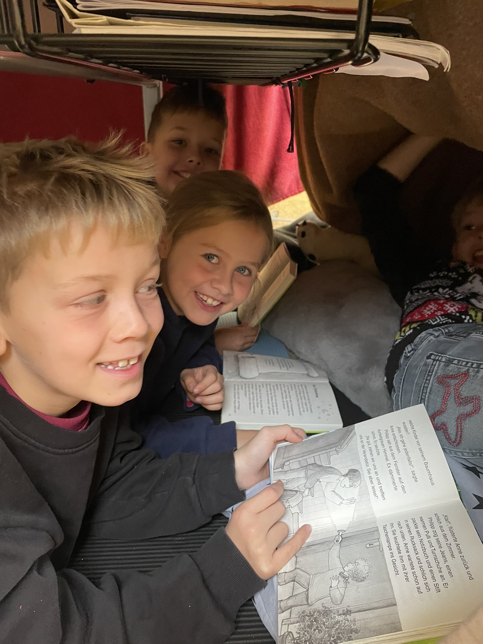 Der diesjährige bundesweite Vorlesetag, der am Freitag, den 21.11.25 stattfand, stand in der Klasse 3c unter dem Motto „Eine Reise mit dem „Magischen Baumhaus“. Das Klassenzimmer wurde in einen magischen Leseraum verwandelt, in dem aus Tischen, Stühlen, Decken und Kissen kleine Baumhäuser gebaut wurden. Jedes Kind suchte sich ein Buch aus der Buchreihe „Das magische Baumhaus“ aus und verkroch sich in sein eigenes „Baumhaus“. Unterbrochen wurde das Selberlesen durch mehrere Vorlesephasen, in denen unter anderem Herr Ryczko als Gastleser den Kindern aus einem Buch der Buchreihe vorlas. Für das leibliche Wohl sorgten die Klasseneltern, die ein kleines Buffet spendierten. Der Vorlesetag war für die Kinder eine wunderbare Abwechslung im Schulalltag.